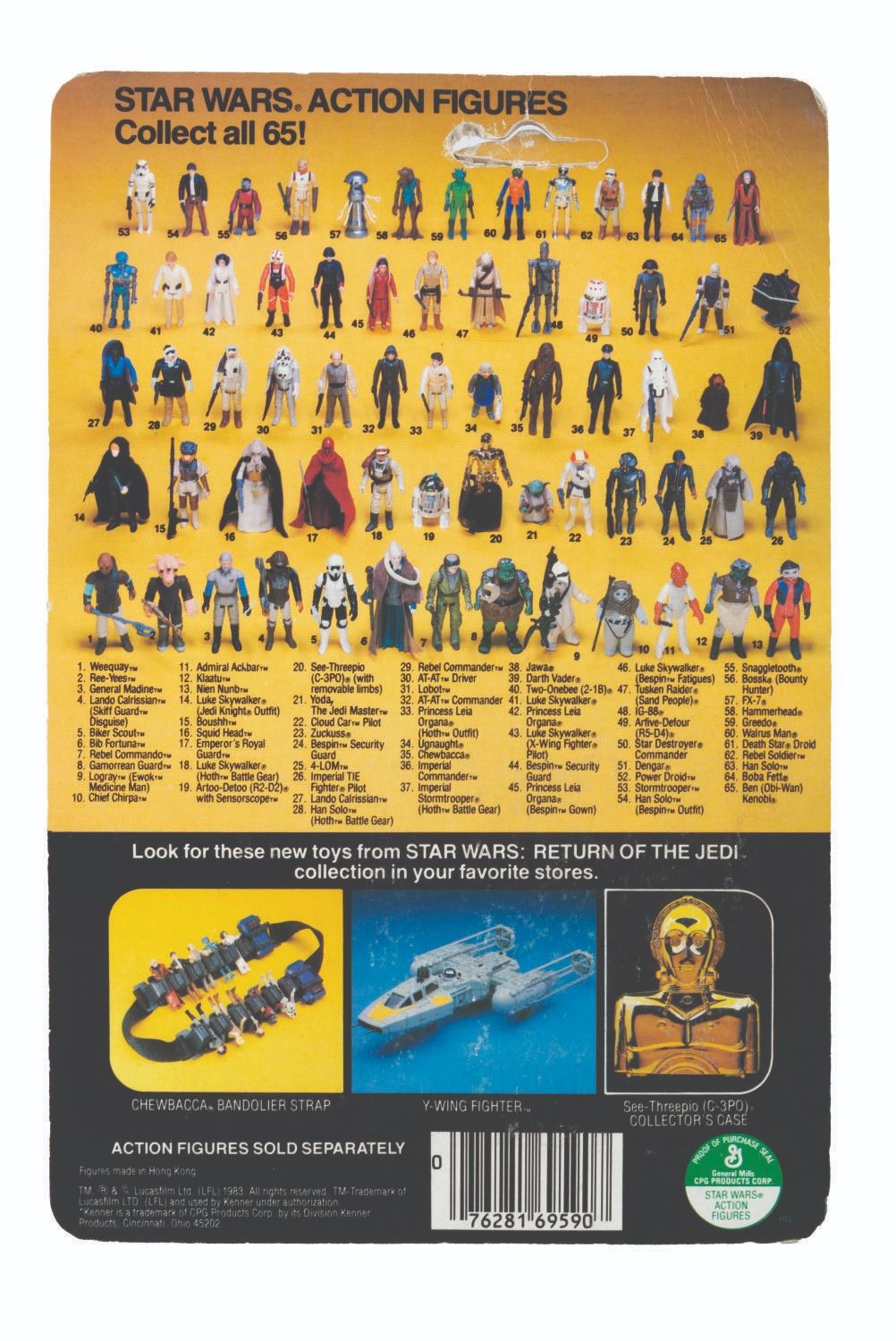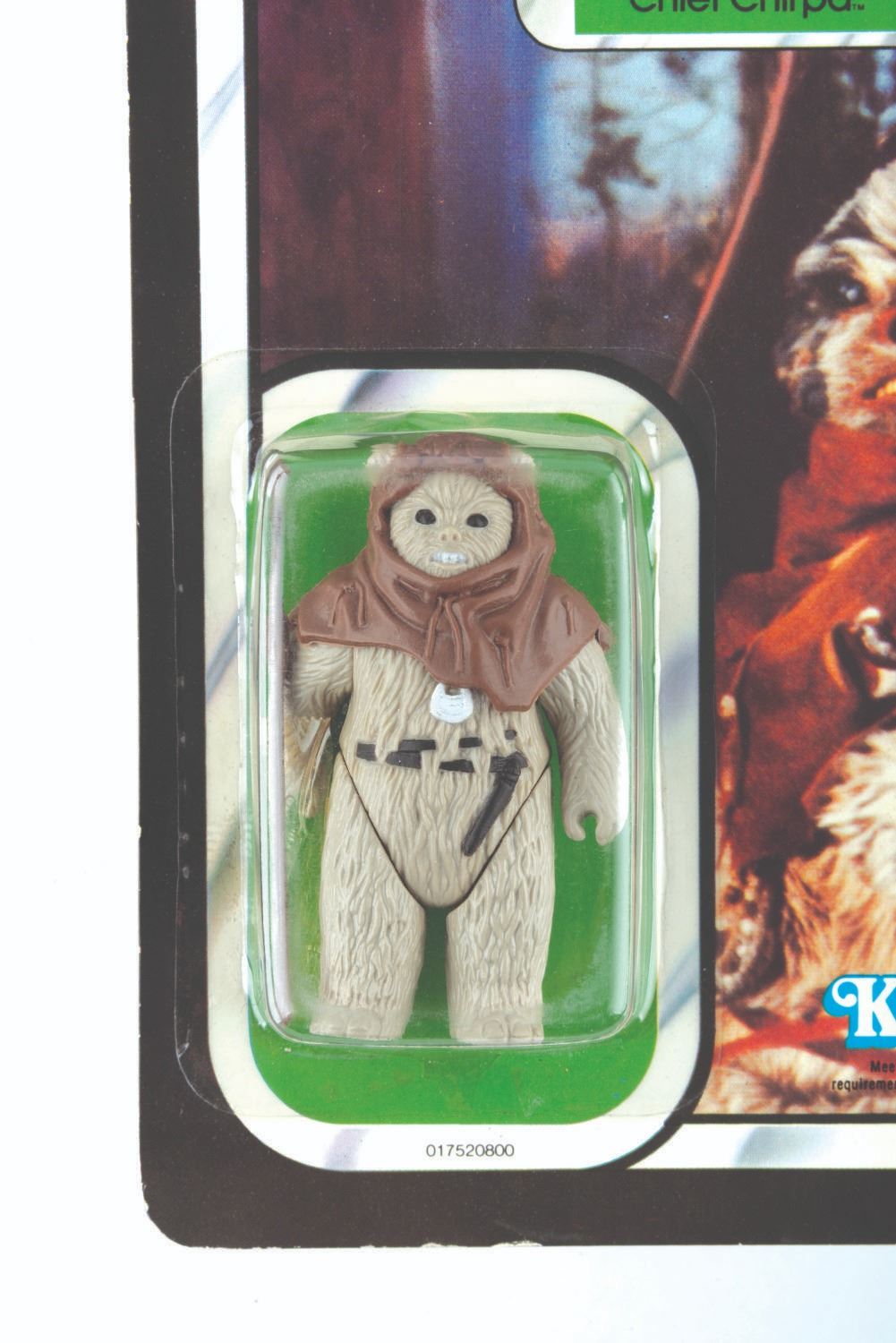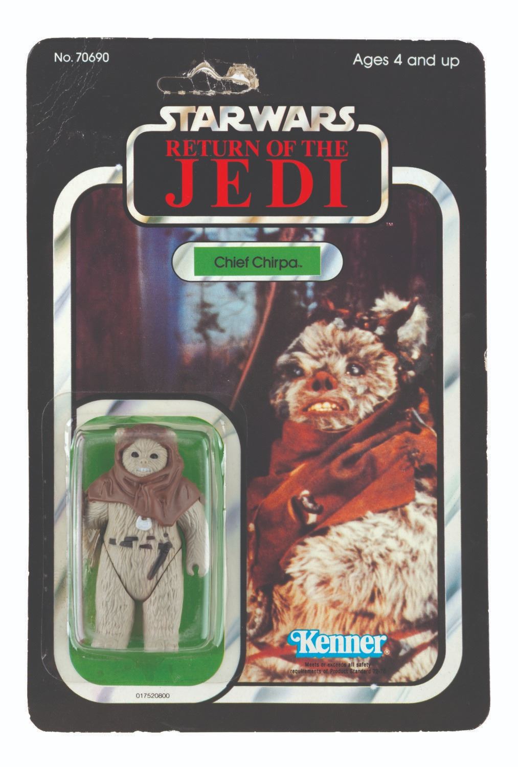 (Kenner, 1983) A “Return of the Jedi” Chief Chirpa action figure on the original card. The 2.75” figure is in fine condition, and the 6” x 9” card is in good condition with edge wear including slight chipping, creases to the upper left corner, and wear to the peg hole.