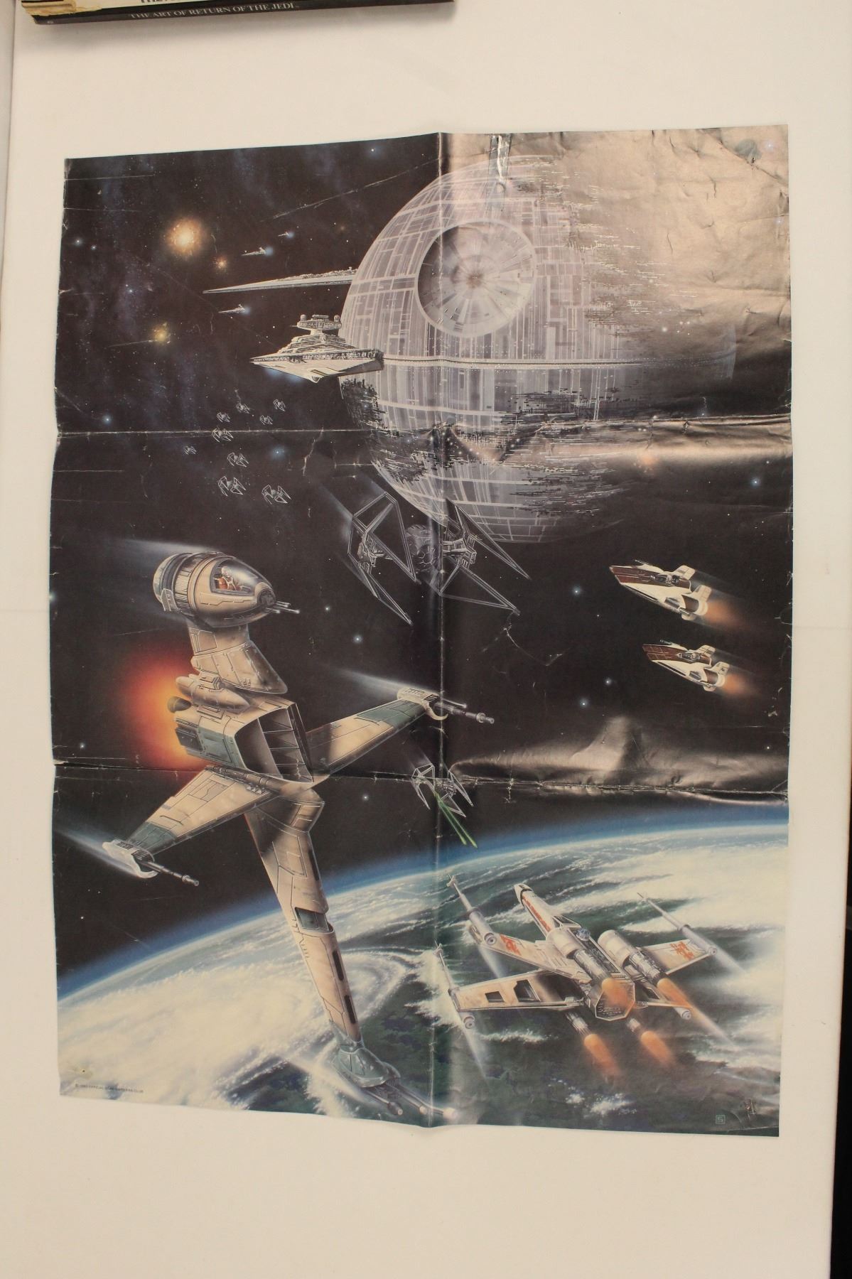 (LFL, 1983) This beautiful poster features the many spacecraft of the original Star Wars Trilogy. The poster has creases from folding, edge wear and wear along the fold lines.