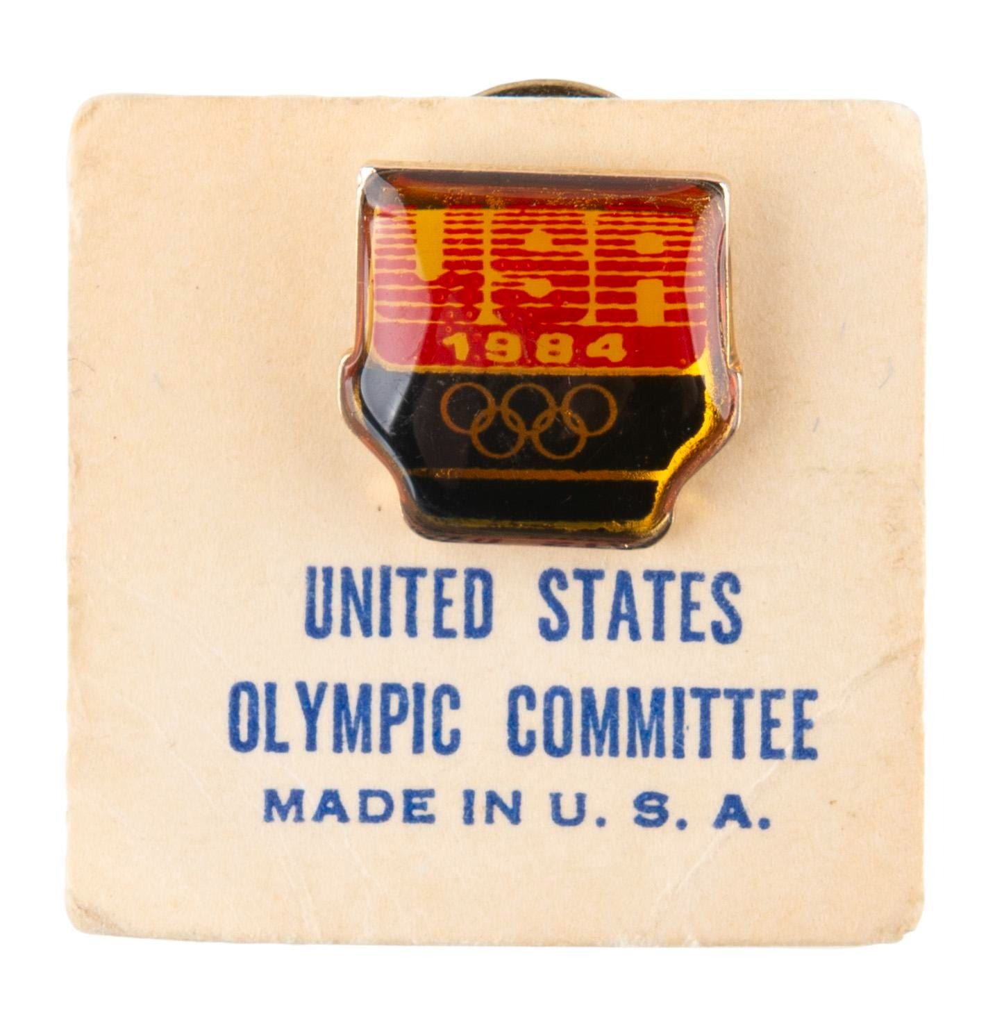 (Olympics, 1984) A USA 1984 Olympics Pin on the original card. Measuring just 0.5" x 0.5" the pin is in fine condition with typical color shift from age.