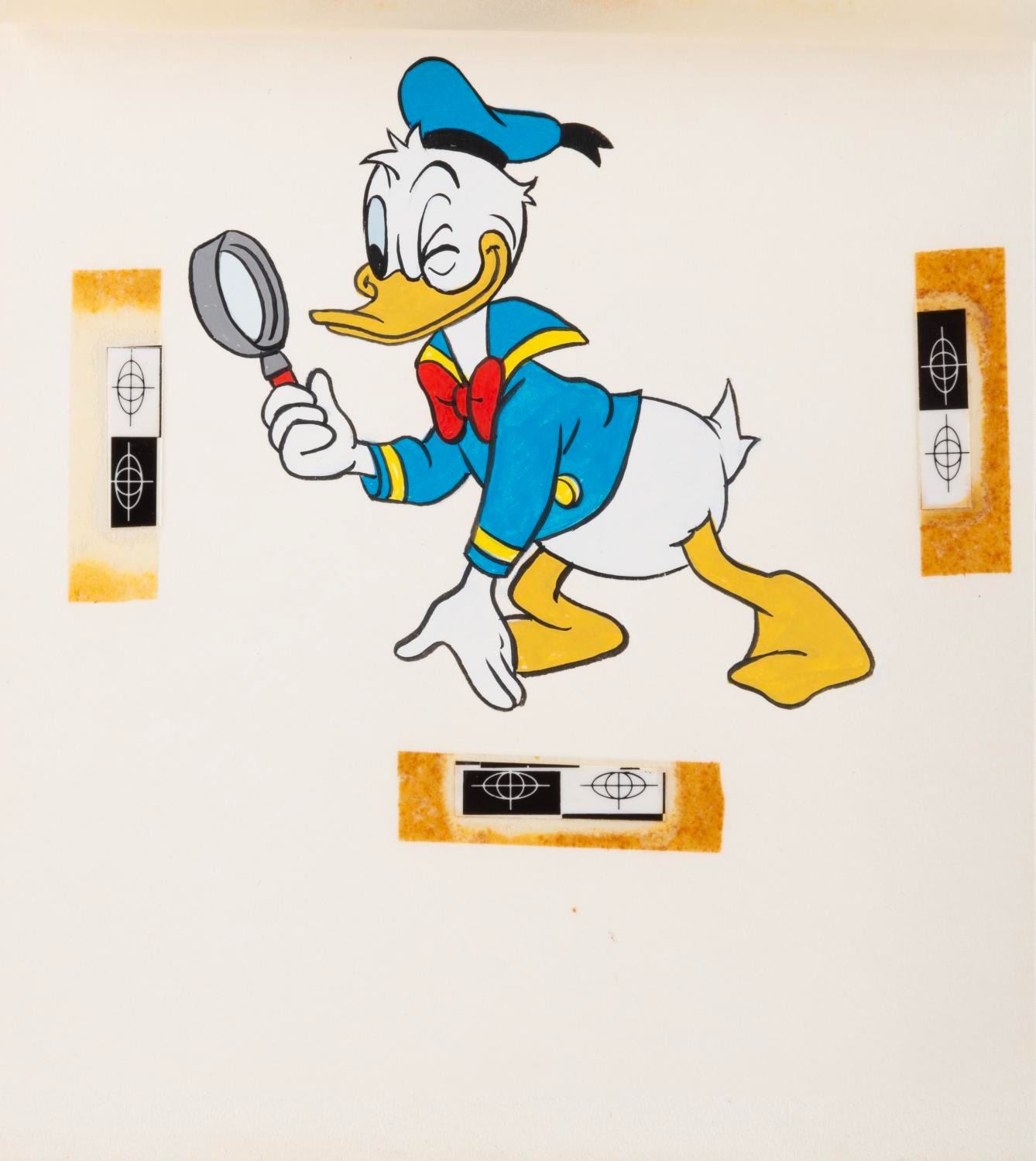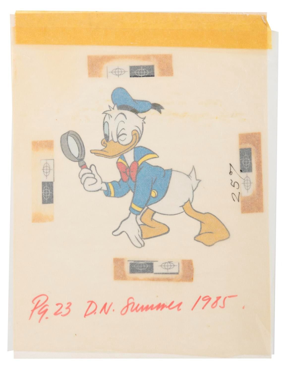 (Disney, 1985) An original painting of Donald Duck with a magnifying glass, created for the Summer 1985 issue of Disney News magazine. The image measures 3.75" x 4" on 8" x 5.75" artist board and is in very good condition.