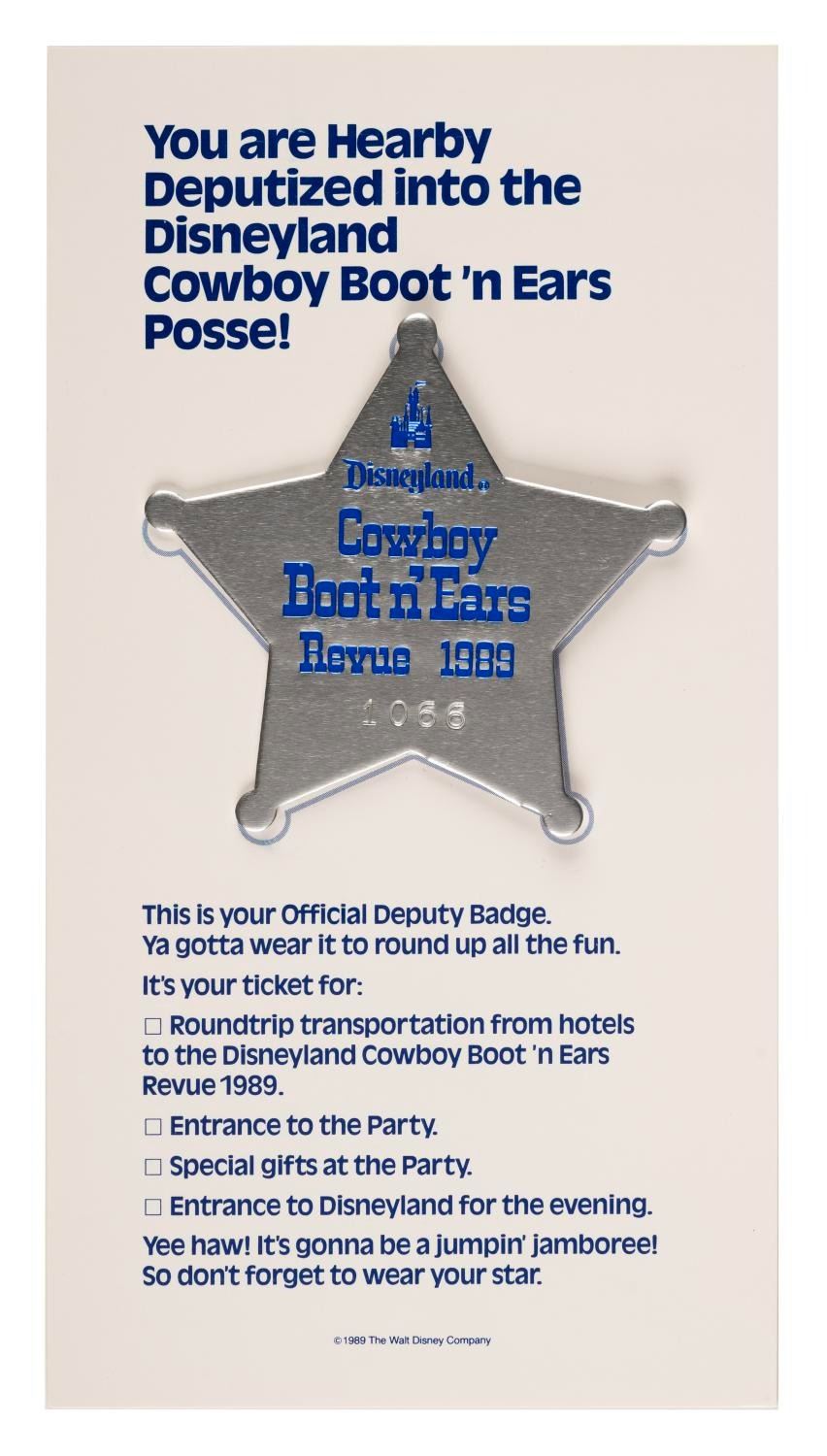 (Disneyland, 1989) An "official" deputy's badge and ticket given to guests of the "Boot N' Ears Revue" special event. Hosted by MLB Commissioner Bart Giamatti and featuring a salute to Gene Autry, the event consisted of Western BBQ, hoe-downs, and a comedic performance by Jay Leno. Measuring 3" x 3" on the original 4" x 7.5" card, the item is in very good condition with light surface scratching on the badge and handling wear to the card.