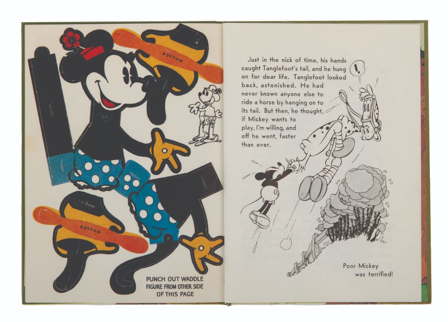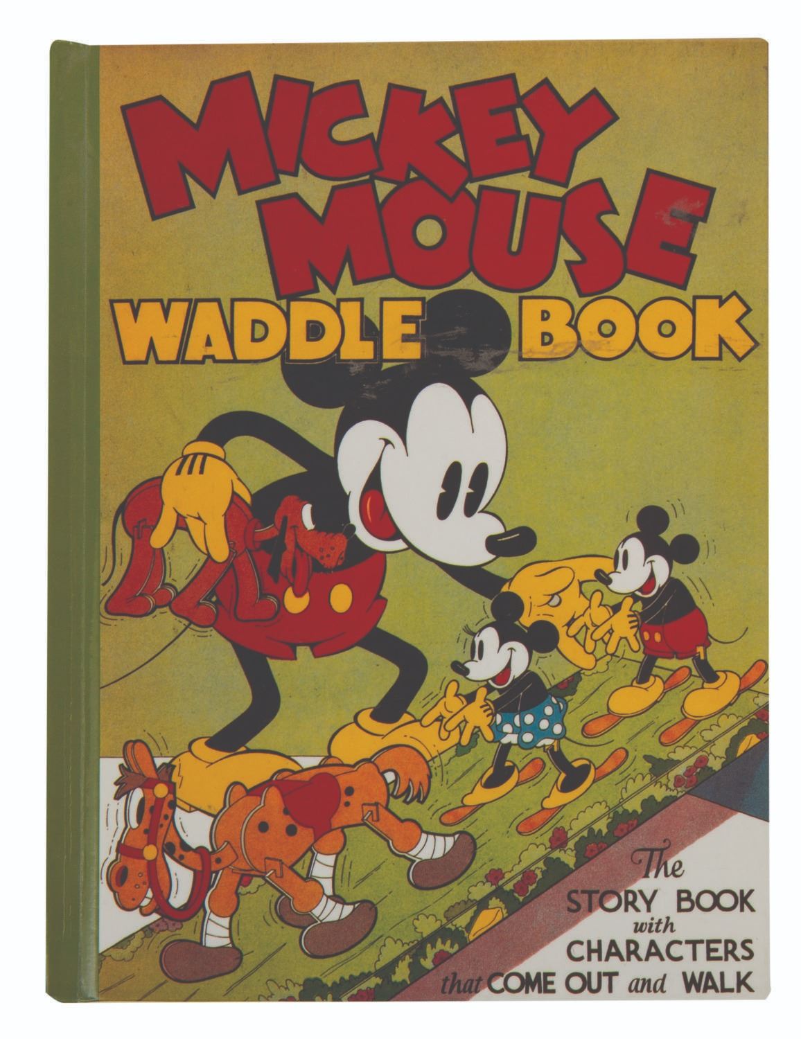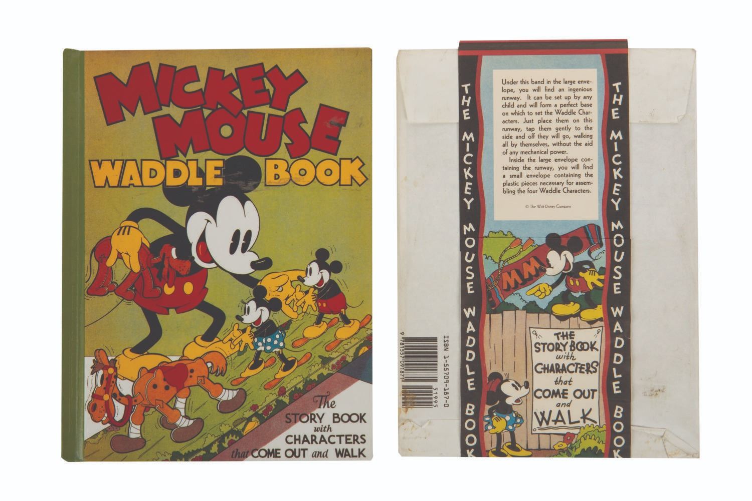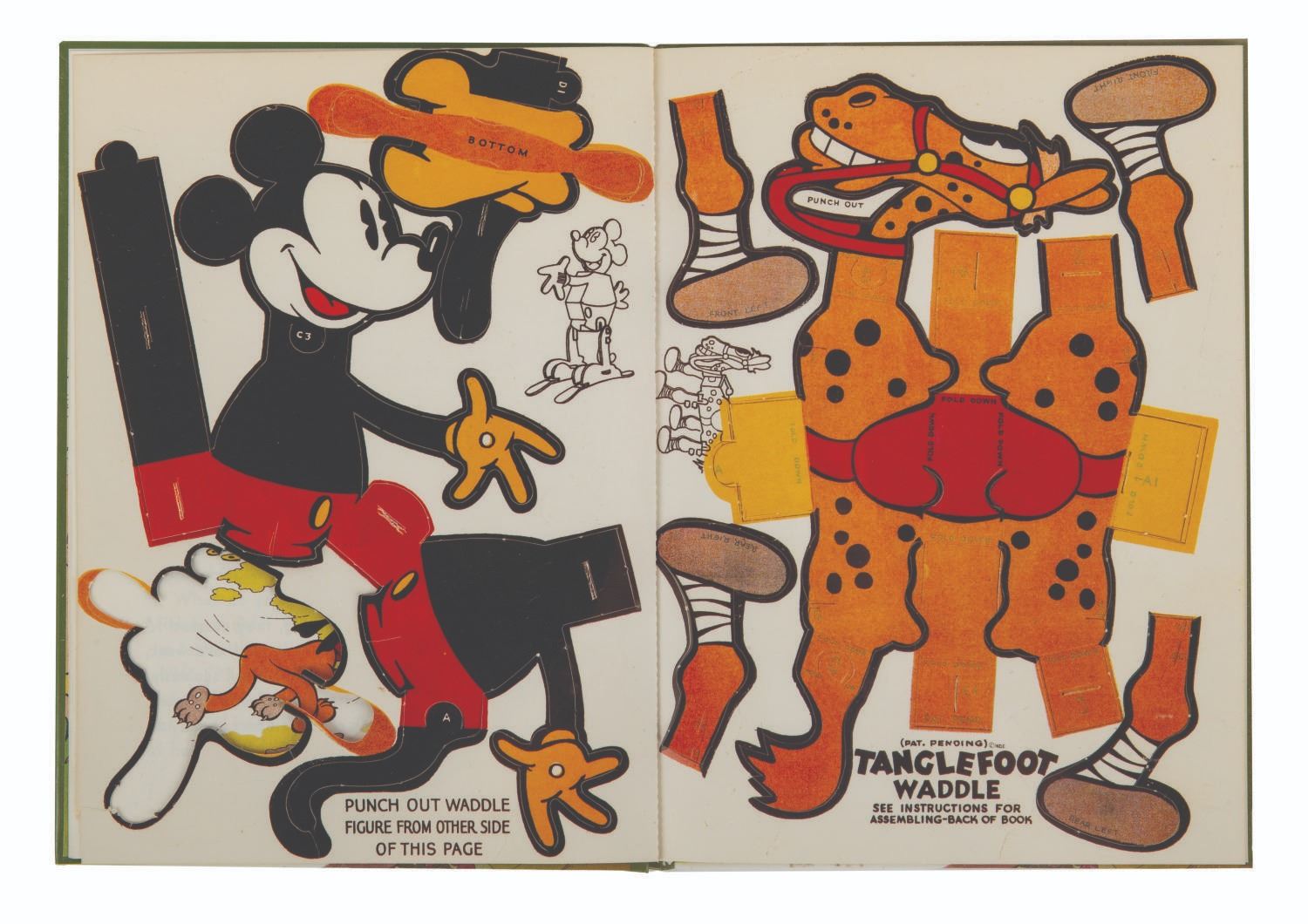 (Applewood Books, 1992) A Mickey Mouse Waddle Book inspired by the extremely rare version published in 1934 by Blue Ribbon Books. Measuring 10.5"x7.75" the book with runway is in good condition, with one punched character piece.