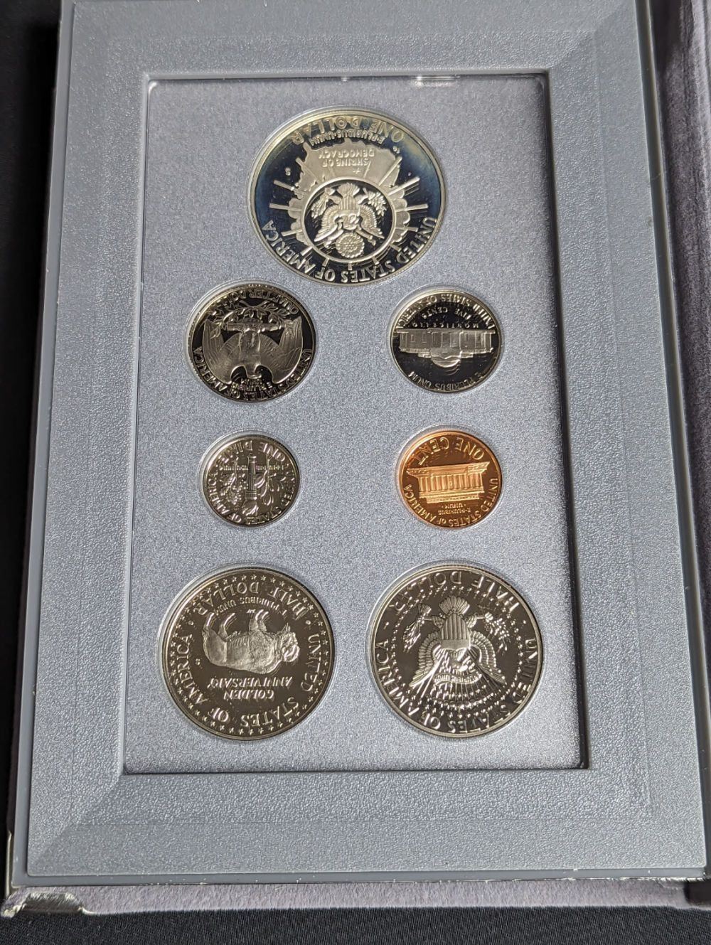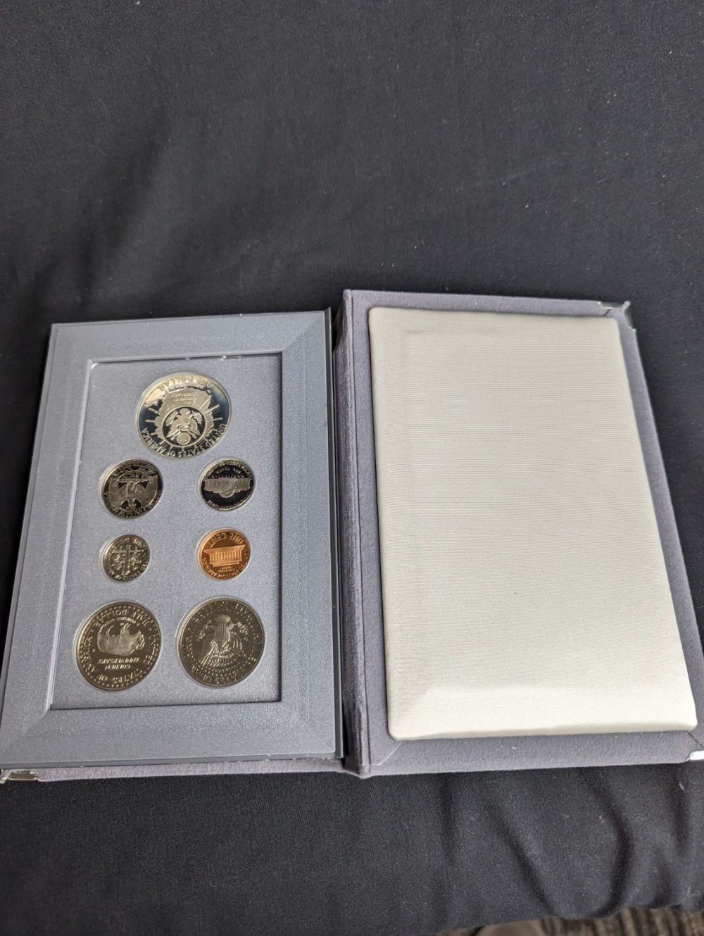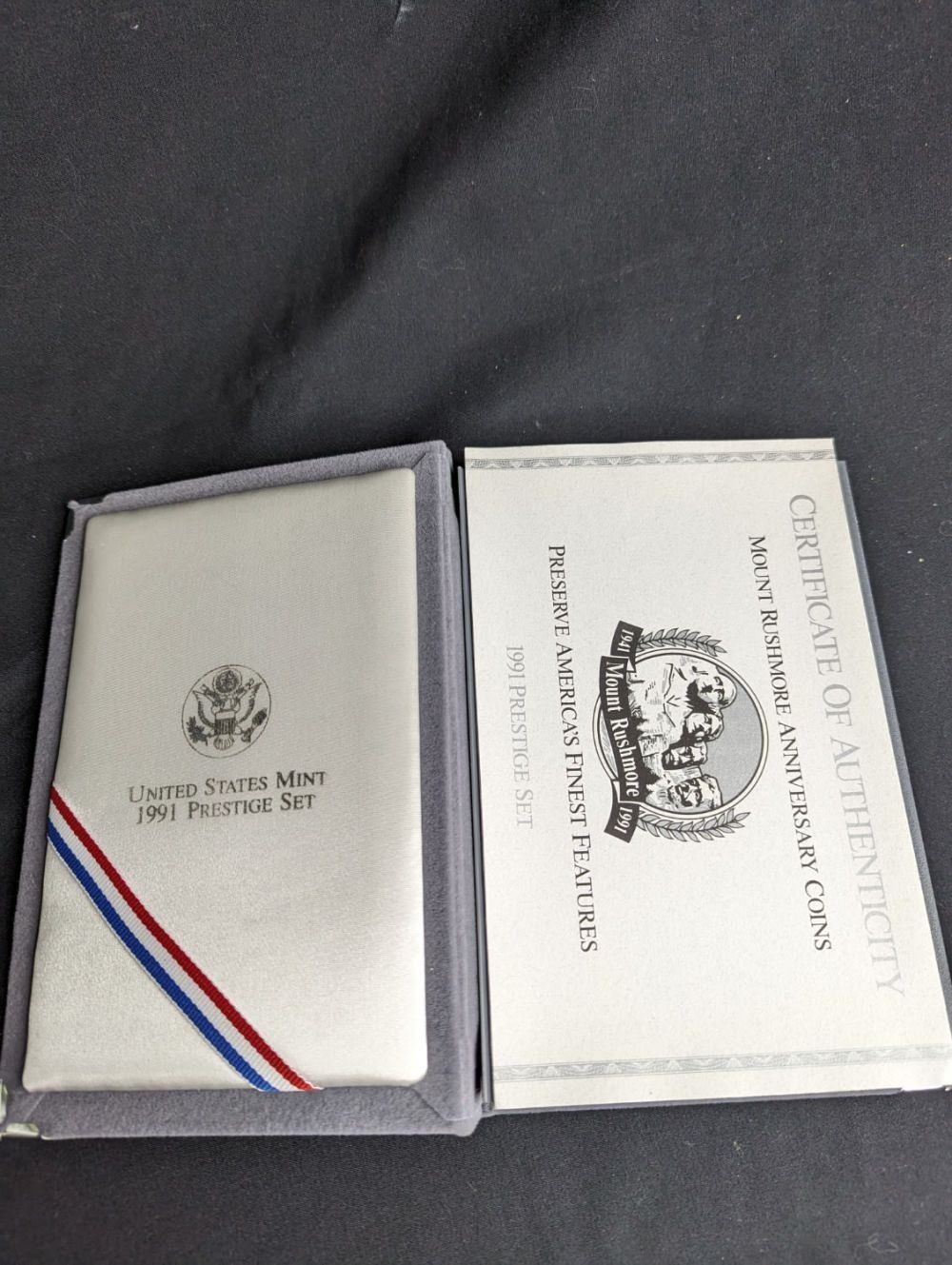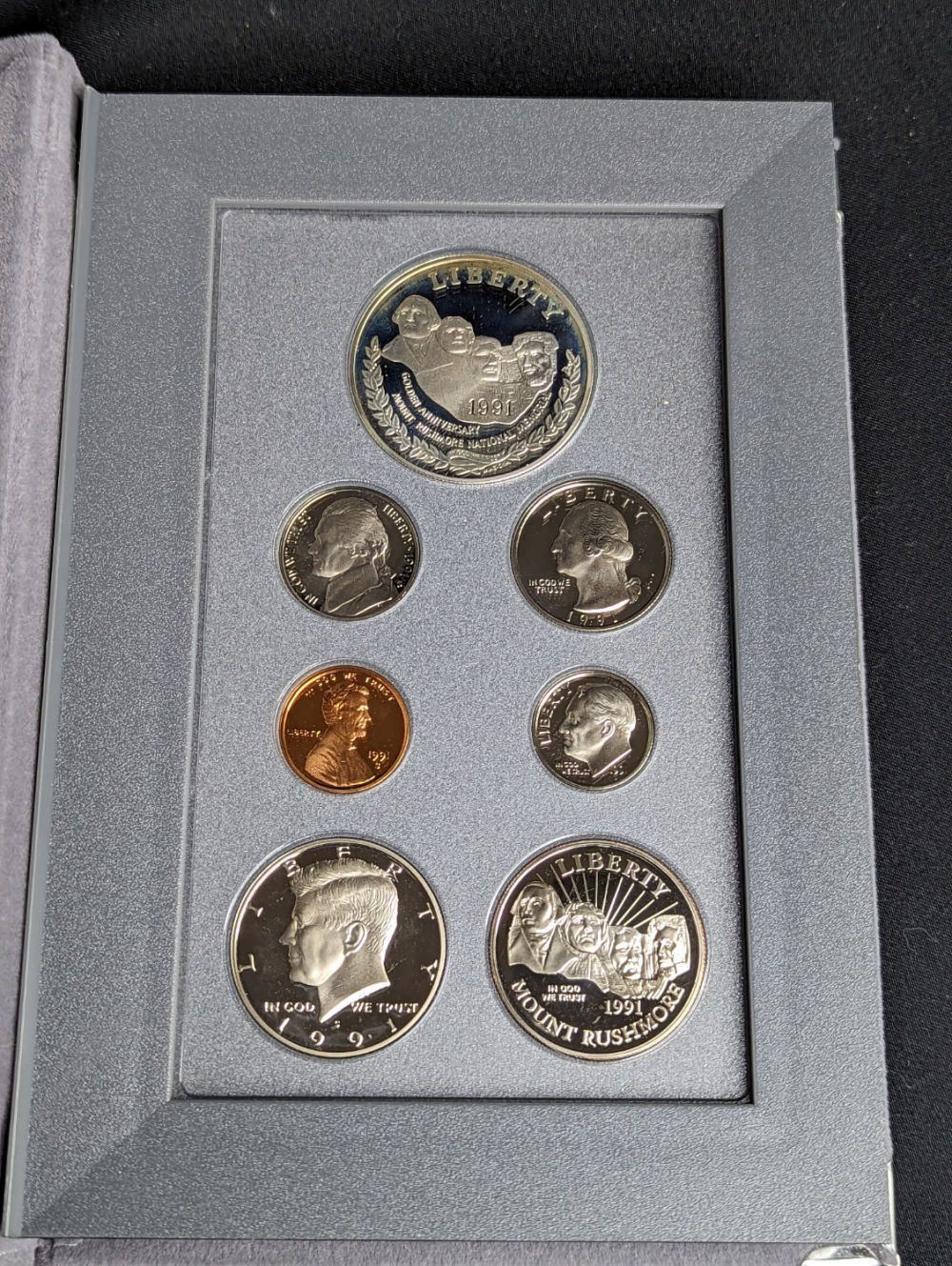 A 1991 Prestige Proof Set featuring Mount Rushmore. This Set Comes with the Proof Circulation Coins from 1991 plus The Mount Rushmore commemorative Silver Dollar and Half Dollar Coins. Beautiful Coins
