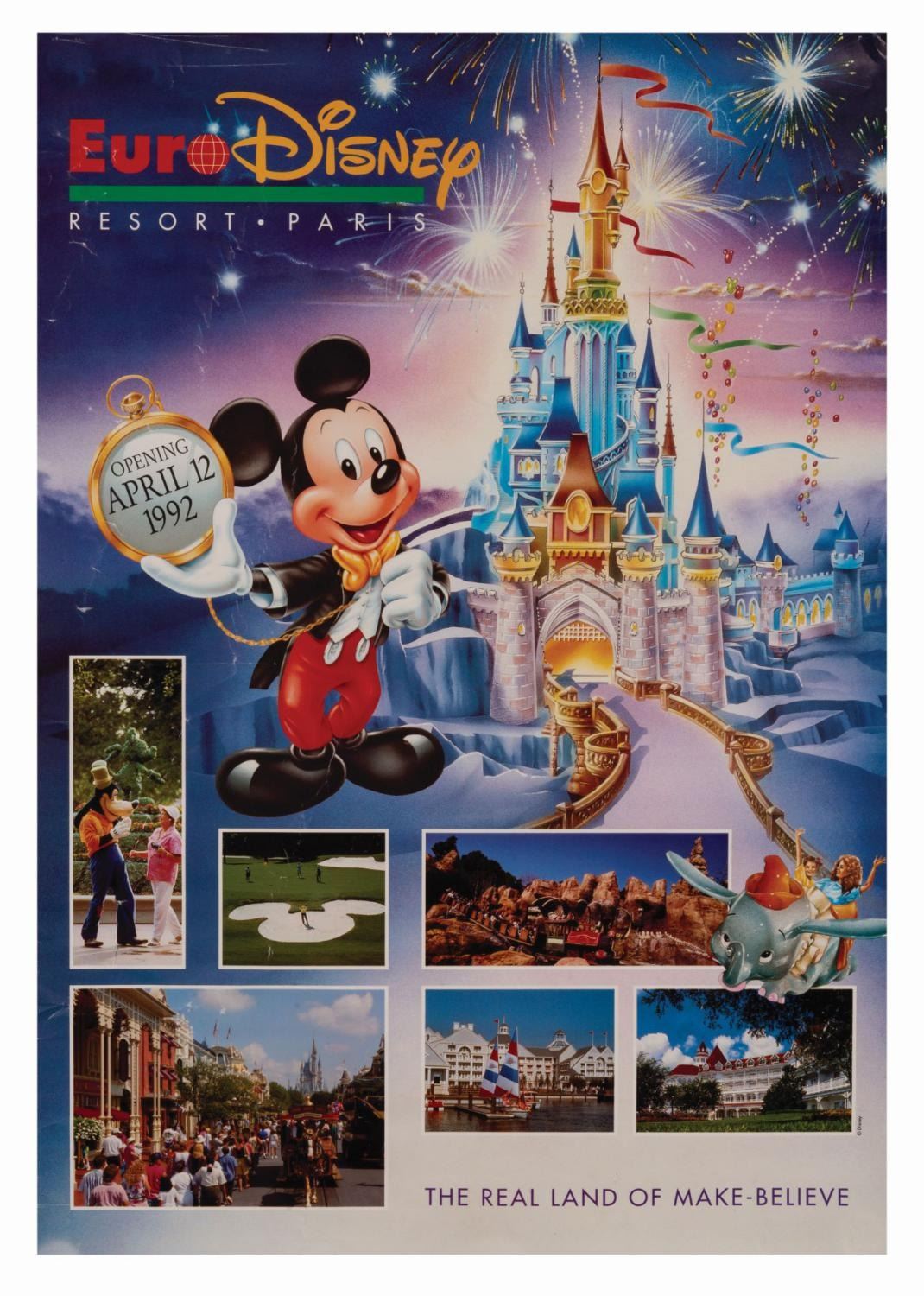 (Disneyland Paris, 1992) A Euro Disney Resort poster heralding the opening of "the real land of make believe" on April 12th, 1992. The poster features imagery of Opening Day attractions as Big Thunder Mountain Railroad, the Disneyland Hotel, Disney's Newport Bay Club, and Golf Disneyland. Measuring 25.5"x17.75", the poster displays beautifully in good condition, with creasing and wear throughout.