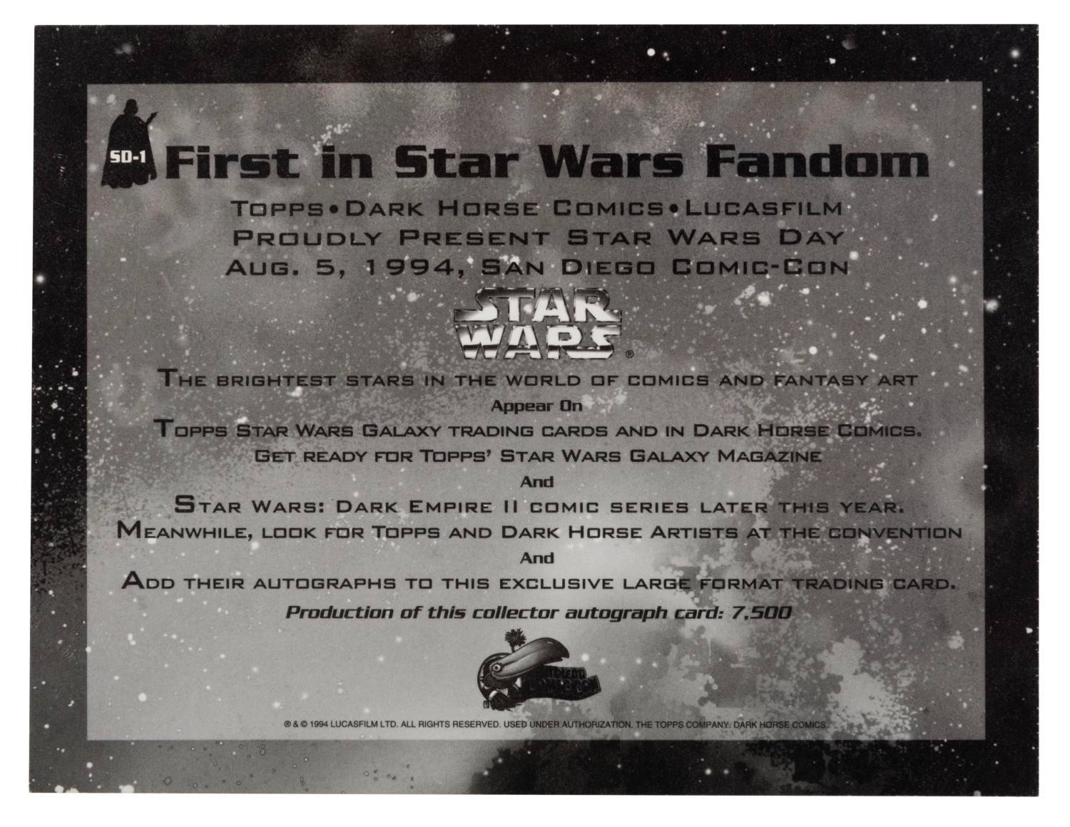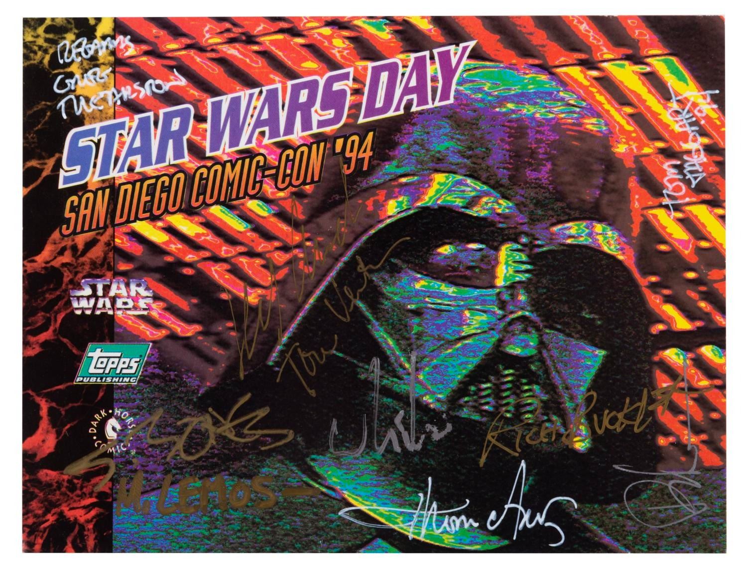 (Topps/Dark Horse Comics, 1994) A souvenir autograph card from Star Wars Day at the 1994 San Diego Comic Con. The card is signed with ten autographs of artists for Topps Cards and Dark Horse Comics. Measuring 5” x 6.5”, the signed card is in fine condition.