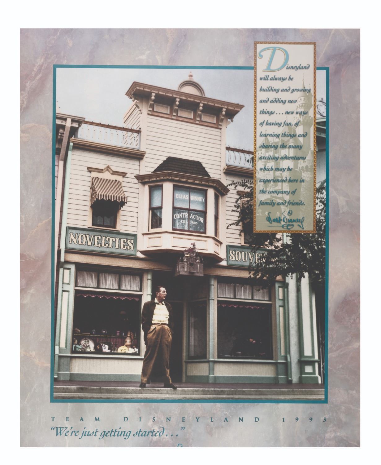 (Disneyland, 1995) A Cast member exclusive Team Disneyland poster featuring a Walt Disney quote with the image of him beneath his father's window on Main Street. Measuring 18" x 22", the poster displays in good condition with two 1" tears in the left and bottom edges.
