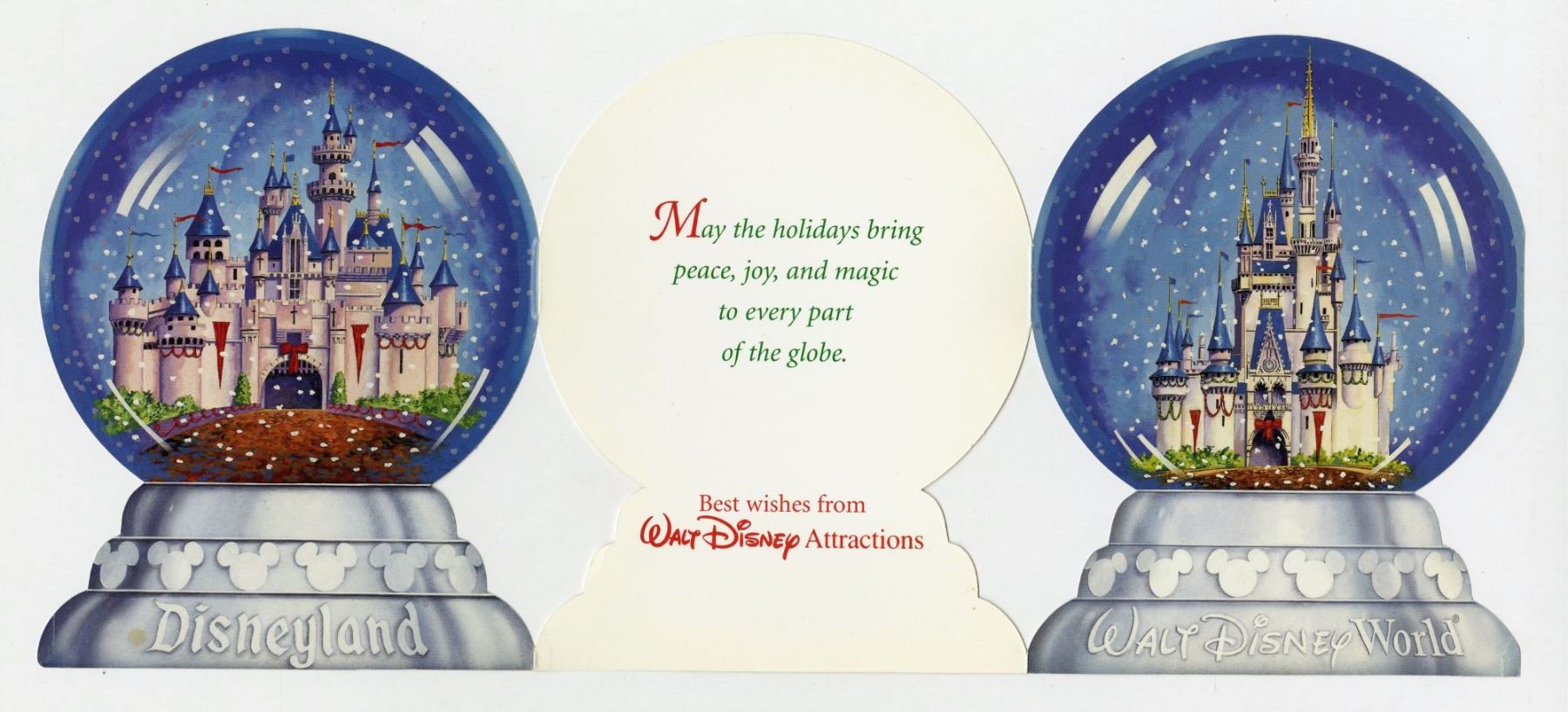 (Disneyland, 1997) A 1997 Walt Disney Attractions Christmas card featuring Sleeping Beauty Castle at Disneyland and Cinderella's Castle at Walt Disney World. Measuring 6.5" x 15" opened and 6.5" x 5" folded, the card is in very good condition with light handling wear and discoloration.