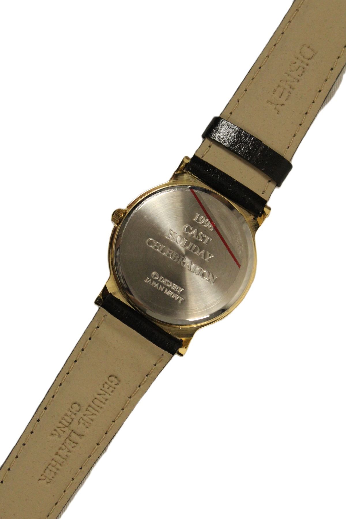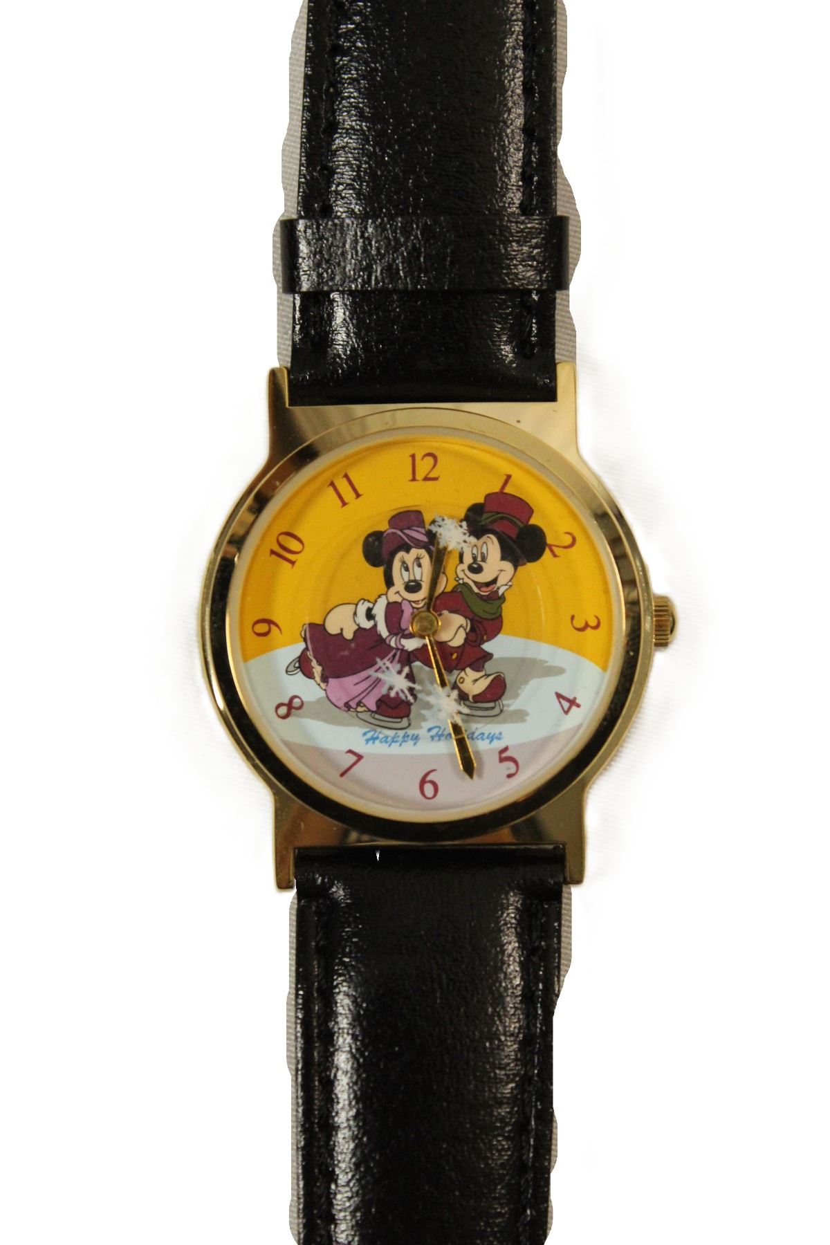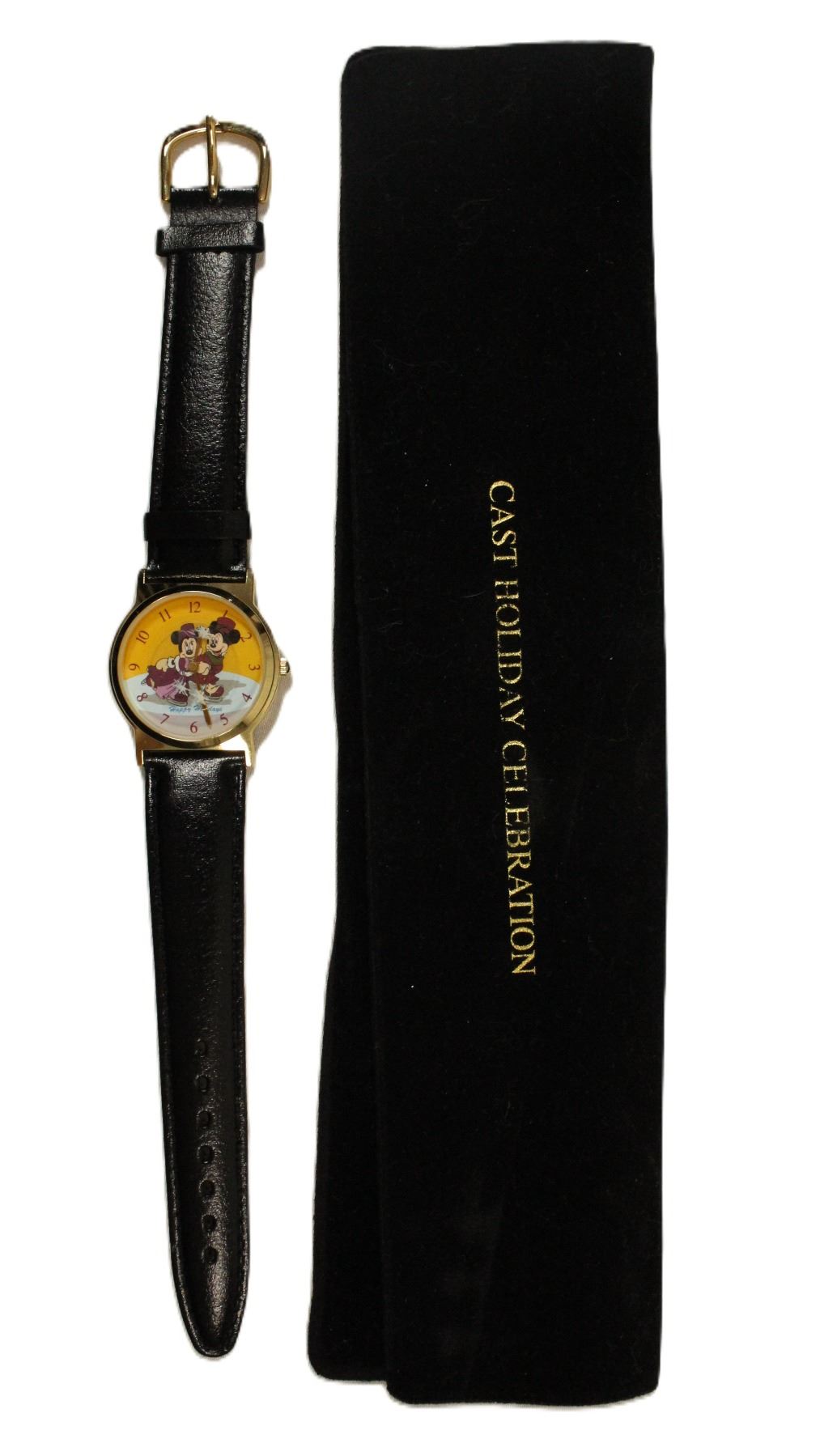This gold colored Cast Member Holiday Celebration watch is from 1998 and features Mickey and Minnie Mouse wearing maroon winter wear with yellow above and tan below a white ice rink. The seconds counter is a clear plastic disc with snowflakes printed on it. The watch is new in package and comes with a black storage sleeve with gold colored embossed words " Cast Holiday Celebration".