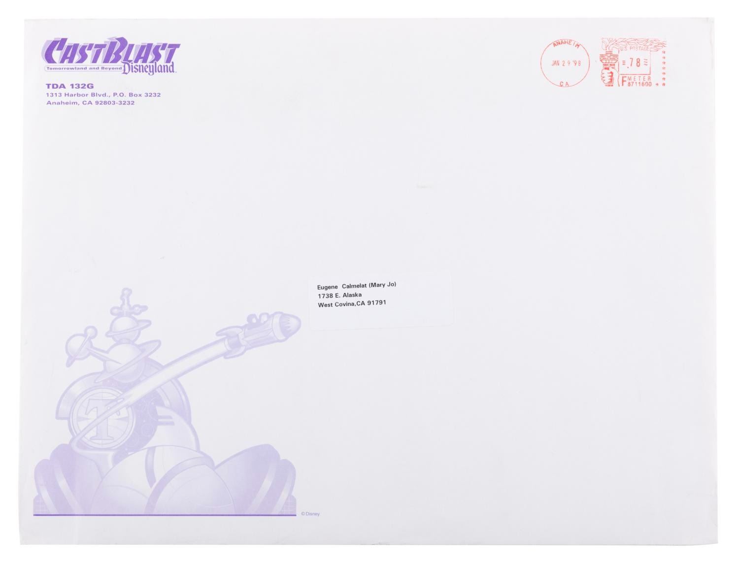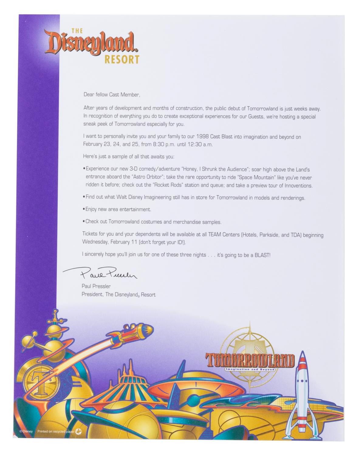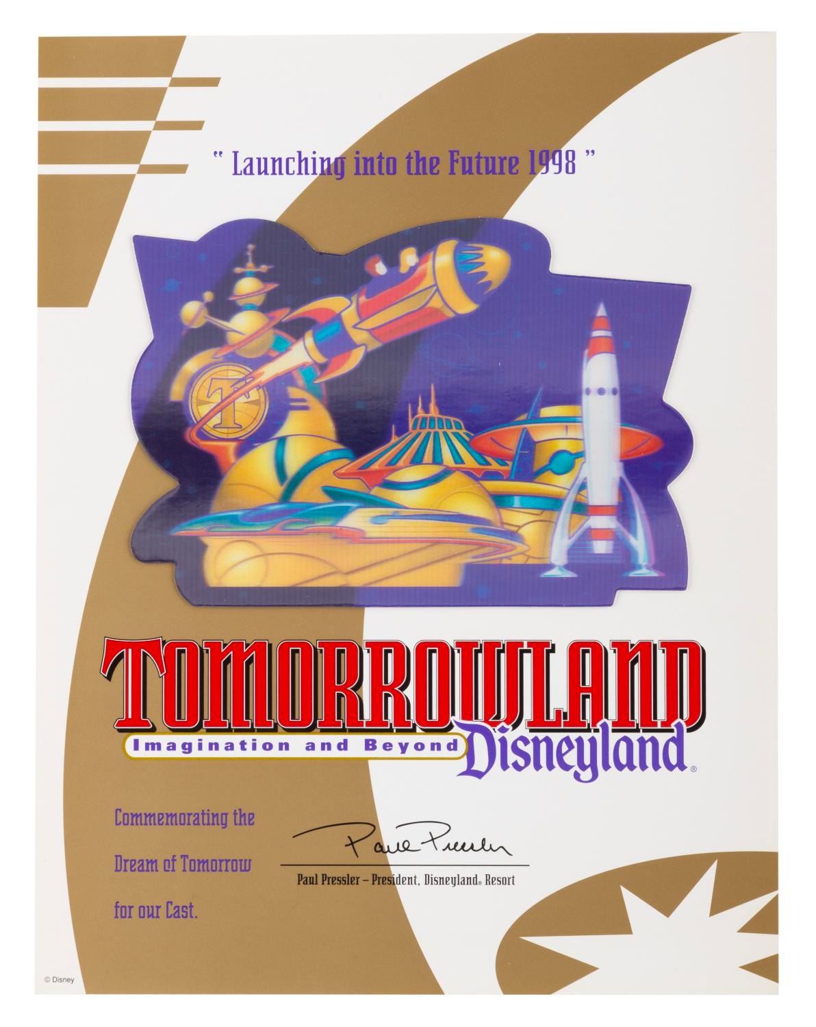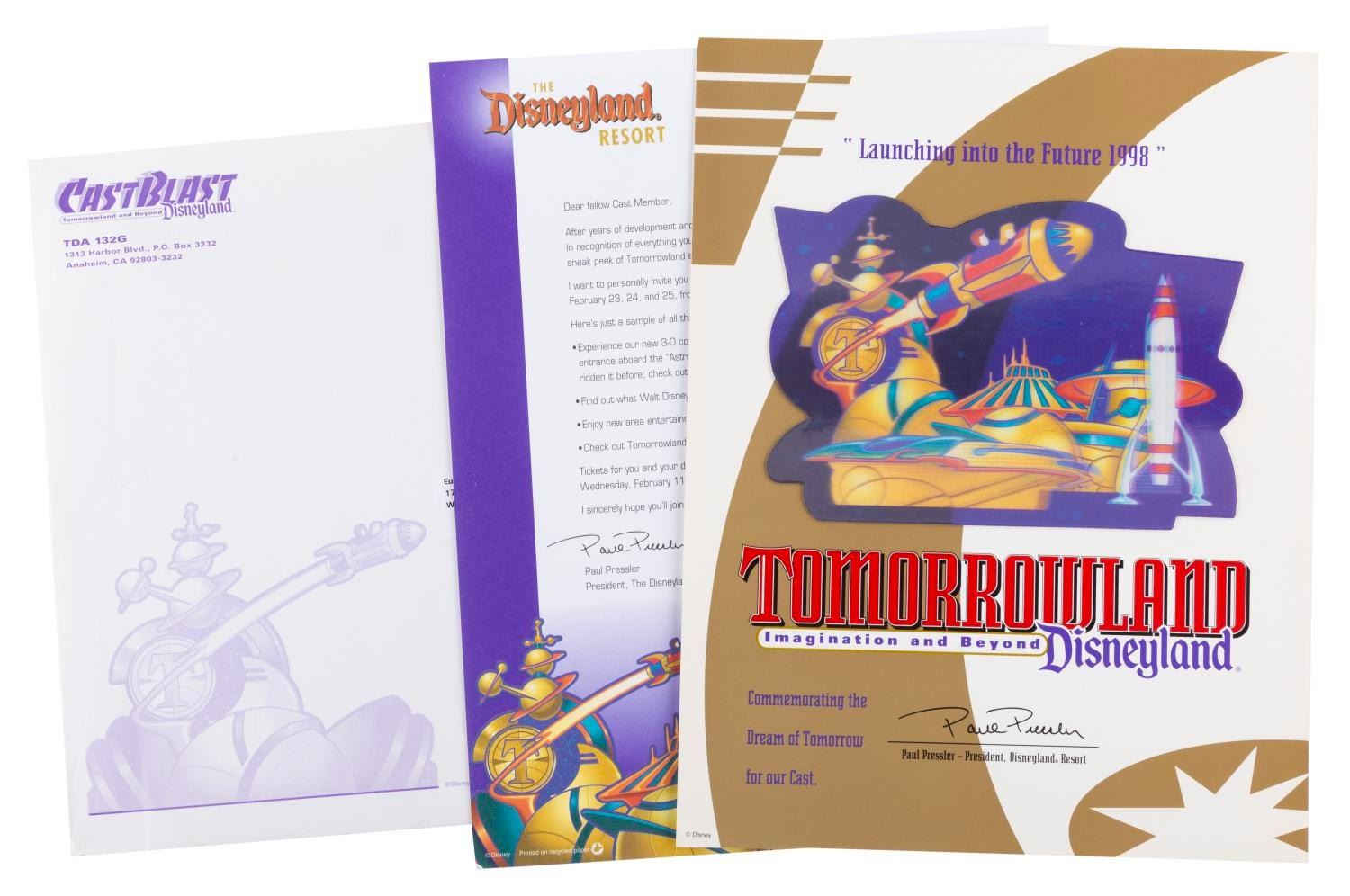 (Disneyland, 1998) A lenticular certificate commemorating the opening of New Tomorrowland at Disneyland, with a letter invitation to the Cast exclusive"Cast Blast" event celebrating the opening. Measuring 8.5" x 11" the certificate and invite are in very good condition with light handling wear.