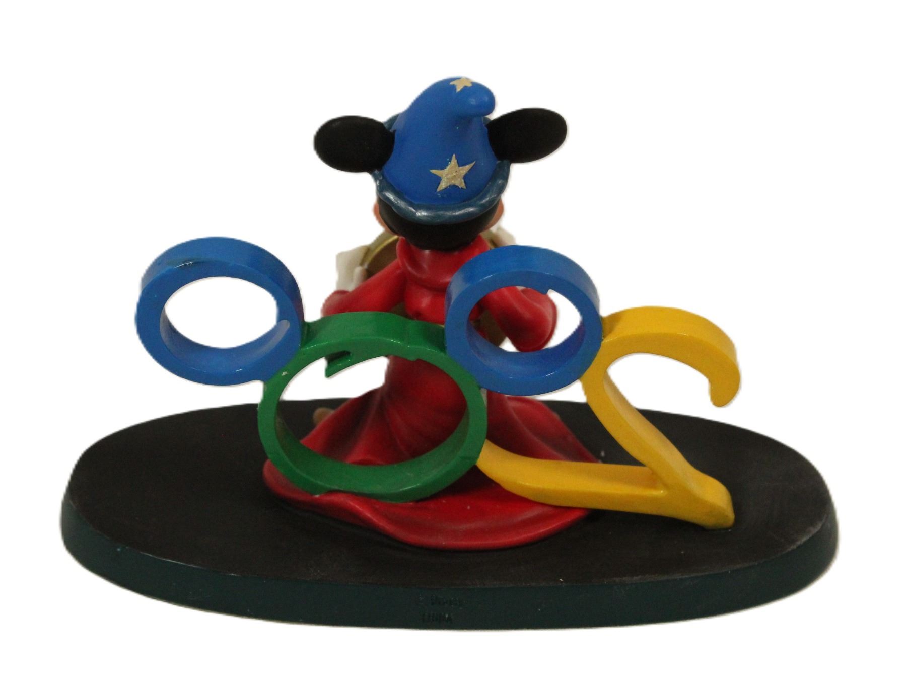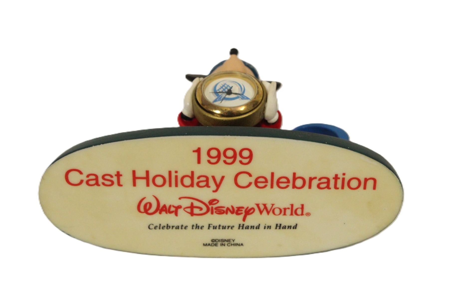 This cast member holiday celebration clock in new in box. It features Sorcerer Mickey holding a gold round clock while standing in front of the number 2000. The face of the clock features the icoic EPCOT geodesic sphere. The bottom is labeled 1999 Cast Holiday Celebration, Walt Disney World, Celebrate the Future Hand in Hand.