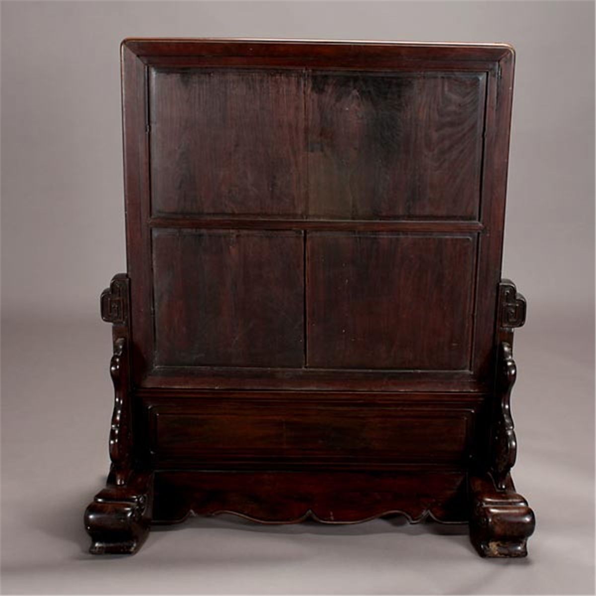 A Floor Screen Inset with Marble Plaques, Framed to display various shaped reserves, all with calligraphic inscriptions and seals, the gray and brown inclusions in the cream-colored stone reminiscent of different landscapes and mountain ranges, the surface of the stone polished to emphasize the image, the hardwood stand carved with scrolling spandrels. 19th/20th Century, 48 x 42 1/2 inches (122 x 108 cm) [Wear, surface soiling. This condition report states major condition issues only.]