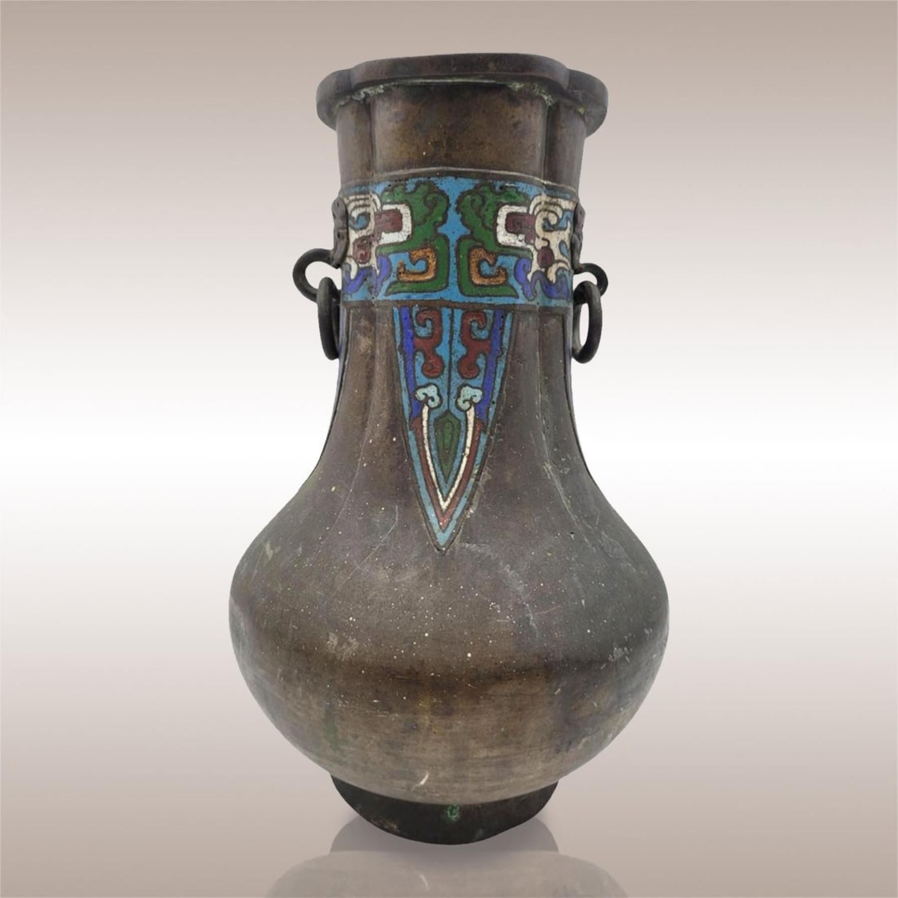 A 19th C Taotie Handled Cloisonne Archaic Style Vase. Measures approx. 12" X 8" X 8".