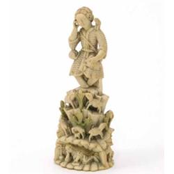 A 19th Century European carved ivory figure of a shepherd, seated above sheep and a reclining woman, 5.75 ins £100-120