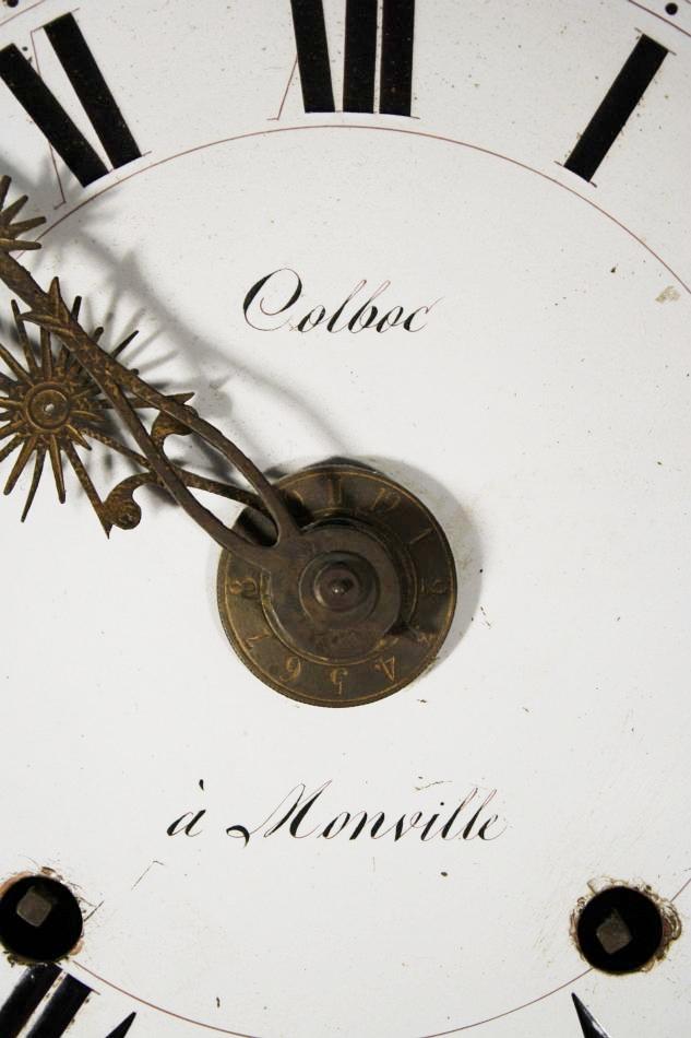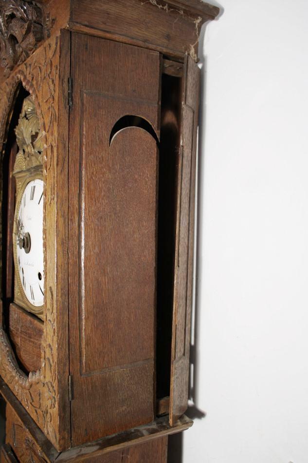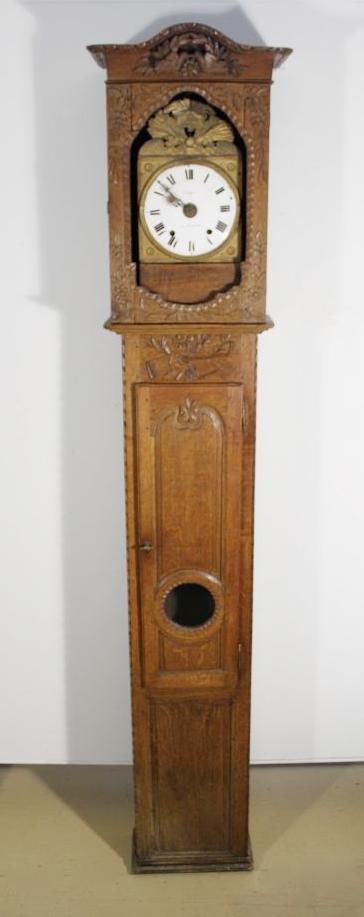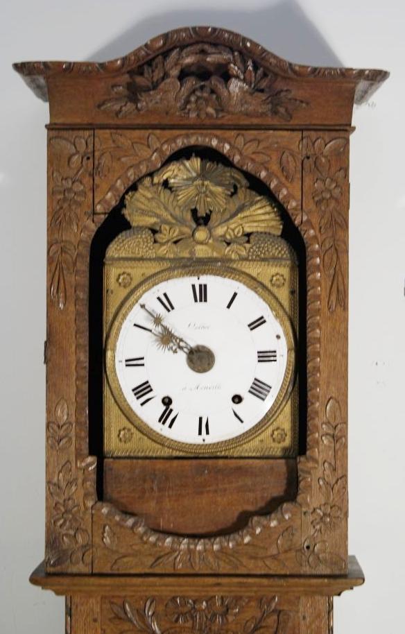 A 19th Century French Provincial Carved Chestnut Tall Case Clock by Colboc à Monville.
