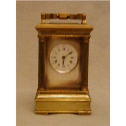 A 19th Century French miniature carriage timepiece the eight day movement with lever platform escapment and enamelled dial in a silvered surround the case with angular handle and fluted classical column corner pieces, 4inches high including handle, with a crocodile skin travelling case. Stamped L.R. £300-£500