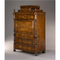 A 19th Century German Mahogany Secretaire a Abattant], the raised plinth top with small drawer over a moulded frieze drawer, the fall enclosing a well-fitted interior, with three further long draws below, all between twist-turned and acanthus-carved corner columns, on turned feet, {174cm by 119cm by 66cm} £2000-3000