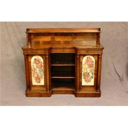 A 19th Century Mahogany Sideboard with Centre Open Adjustable Shelves Flanked by 2 Cupboards Having Glazed Panelled Doors with Floral Tapestry and Double Pillasters. Shaped Top with Galleried Shelf Over Having Turned Supports. 56" Wide. Est. 1000-1500