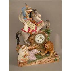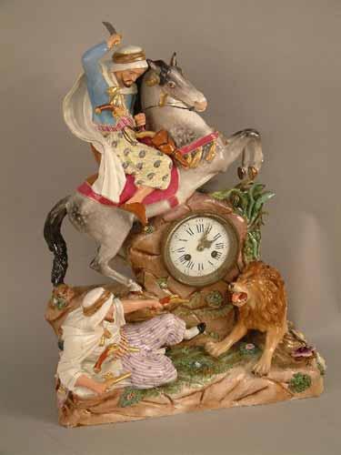 A 19th Century Meissen porcelain mantel clock, modelled with two warriors, one on horseback, each in defence of a marauding lion, clock with enamelled dial and French movement 18in. - mechanism faulty £600-800