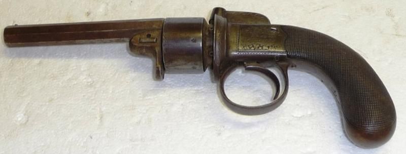 A 19th Century Six Shot Percussion Cap Transitional Revolver by Boston of Wakefield, with 11cm octagonal steel barrel, the cylinder with Birmingham proof marks, bar hammer and chequered walnut bag butt