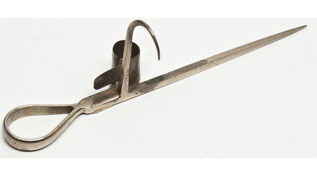 A beautiful 6.75" Tommy Knocker style miners' candlestick. Highly polished with a squared spike. There are no numbers letters or markings to designate origins. It is blacksmith made and style suggests 19th Century. Again, simplicity and beauty are the main characteristics here. Not listed in Wilson. RCS 52. - Ken & Rosemary Roberts Collection -59133