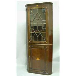 A 19th Century inlaid mahogany corner cabinet, with astragal glazed door, over a fielded panelled...
