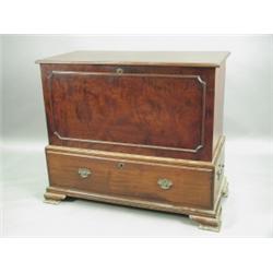 A 19th Century solid mahogany mule chest with a hinged lid over a panelled front on a stand with a single drawer raised on ogee bracket feet, stamped T. Willson, 68 Great Queen Street, London, 122cm wide