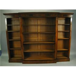 A 19th Century style mahogany breakfront open bookcase with a moulded cornice over adjustable shelves and a plinth base, 2.4m wide x 1.75m high