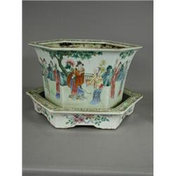 A 19th century Canton enamel hexagonal jardiniFre and stand with polychrome enamel figural decoration, 19.5cm high 29cm wide Est. 150/200