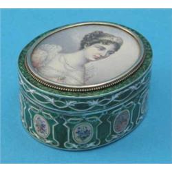 A 19th century Continental silver and green enamel oval snuff box, the lid inset with a watercolour on ivory miniature of a young lady in a pink dress with pearls and a tiara, the sides decorated with swags and floral roundels, 3ins £500-600