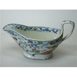 A 19th century Davenport Stone China sauce boat, each side printed and painted with a pheasant reaching back to take a butterfly amongst flowers, printed mark, 18cm wide £30-50
