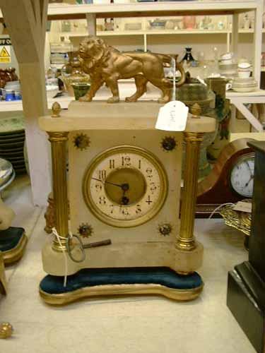 A 19th century French alabaster and spelter mantel timepiece, H 33cms W 23cms, and an oak timepiece £80-120
