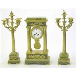 A 19th century French bronze and onyx clock garniture, comprising a Corinthian portico clock with enamelled dial and bell-striking Roblin et Fils movement, 20ins high and a pair of 5-sconce candelabrum £1,800-2,200