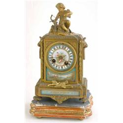 A 19th century French ormolu and porcelain mantel clock, surmounted with a figure of Cupid, and painted with musical trophies, 11.75ins £400-600