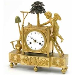 A 19th century French ormolu mantel clock, cast with a cherub gardener, a rake, a shovel and a watering can, all surmounted by a bronze shrub, movement count-wheel striking on a bell (dial cracked) 10.75ins £2,500-3,000