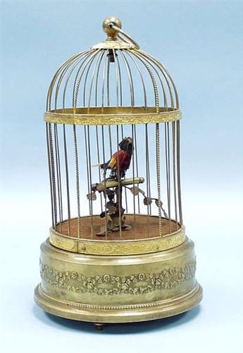 A 19th century German bronze singing bird cage fitted with a bird with a winding mechanical movement. Circa 1870. 10" high. 2000-2500