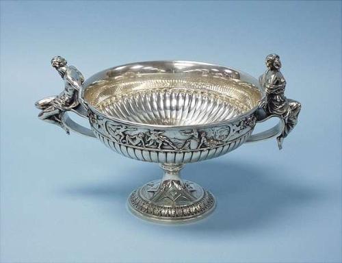A 19th century Italian centrepiece with two sculpted maidens seated on applied handles. Approx. 1500 grams. Circa 1880. 3500-3800