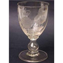A 19th century Jacobite rummer, bowl engraved with Jacobite emblems of rose and two buds surmounted by coronets, devil offering the House of Hanover to obverse, on hollow-knop stem and conical, folded foot, 6.75in. £120-160