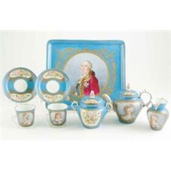 A 19th century Sevres-style cabaret set, consisting of teapot and sugar bowl, both with covers, milk jug, two cups and saucers, on rectangular tray, painted with named members of the Louis XVI household against a gilded bleu-celeste ground. £400-600