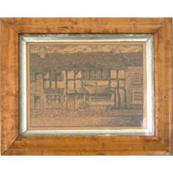 A 19th century Tunbridgeware panel of cottages, reputed to be of Stratford in a glazed burr maple frame, inscription verso, 9ins £100-150