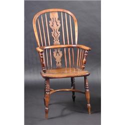 A 19th century beech and elm Windsor armchair, the arched spindle turned back with pierced splat above bowed arms and saddle seat supported on ring turned legs united with a crinoline stretcher £200-300