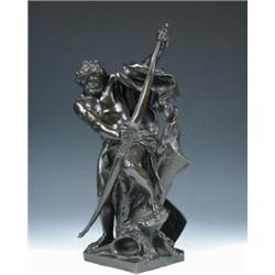A 19th century bronze figure of an archer straining to string his bow, the bearded man wears only a cloak, his helmet, shield and quiver by the tree trunk on which he rests one foot, dark brown patination, 37cm high £250-350