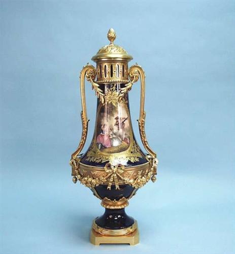 A 19th century bronze mounted Sevres porcelain covered vase. Hand painted on cobalt blue ground with romantic motives within a gold encrusted medallion. Twin bronze handles. Unusual form. 31" high. French, circa 1860. 8000-9000
