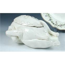A 19th century creamware tureen and cover in the form of a dressed chicken, the breast applied with.
