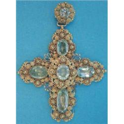 A 19th century gold cannetille work cruciform pendant, set 5 oval aquamarines, the matching loop with a round aquamarine £200-300