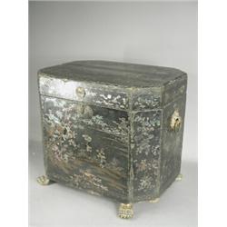 A 19th century oriental lacquered and mother of pearl inlaid 'wig box' with mask handles and claw feet, 45cm wide Est. 150/180
