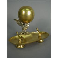 A 19th century ormolu desk stand with a white metal bird supporting a globe inkwell, 14cm Est. 120/150
