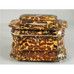 A 19th century sarcophagus shaped tortoiseshell tea caddy with white metal escutcheon and initialled plate to lid, 19cm Est. 1000/1200
