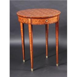 A 19th century satinwood and mahogany side table, the parquetry inlaid and crossbanded circular top above a similarly inlaid frieze fitted with a single drawer supported on square section tapering legs with brass caps, 55cm diameter £400-600