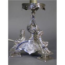 A 19th century silver plated centrepiece (converted to a table lamp), struck G.S., the cherubs with registration marks to the underside, height excluding shade 21cm Est. 250/300