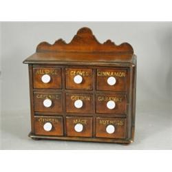 A 19th century spice chest with an arrangement of nine drawers, each named, with white bun handle...